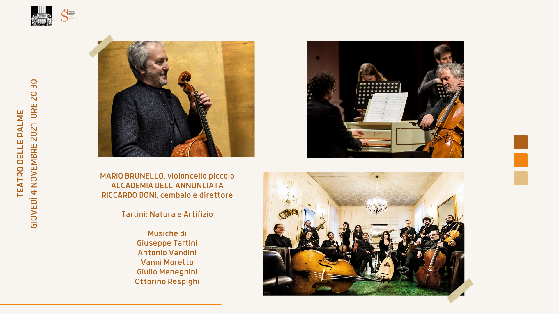 Giovedì 4 novembre 2021 – Teatro delle Palme – ore 20.30 ACCADEMIA DELL’ANNUNCIATA MARIO BRUNELLO, violoncello piccolo RICCARDO DONI, cembalo e direttore Tartini: Natura e Artifizio GIUSEPPE TARTINI (1692 – 1770) Concerto in la maggiore per violoncello piccolo, archi e...
